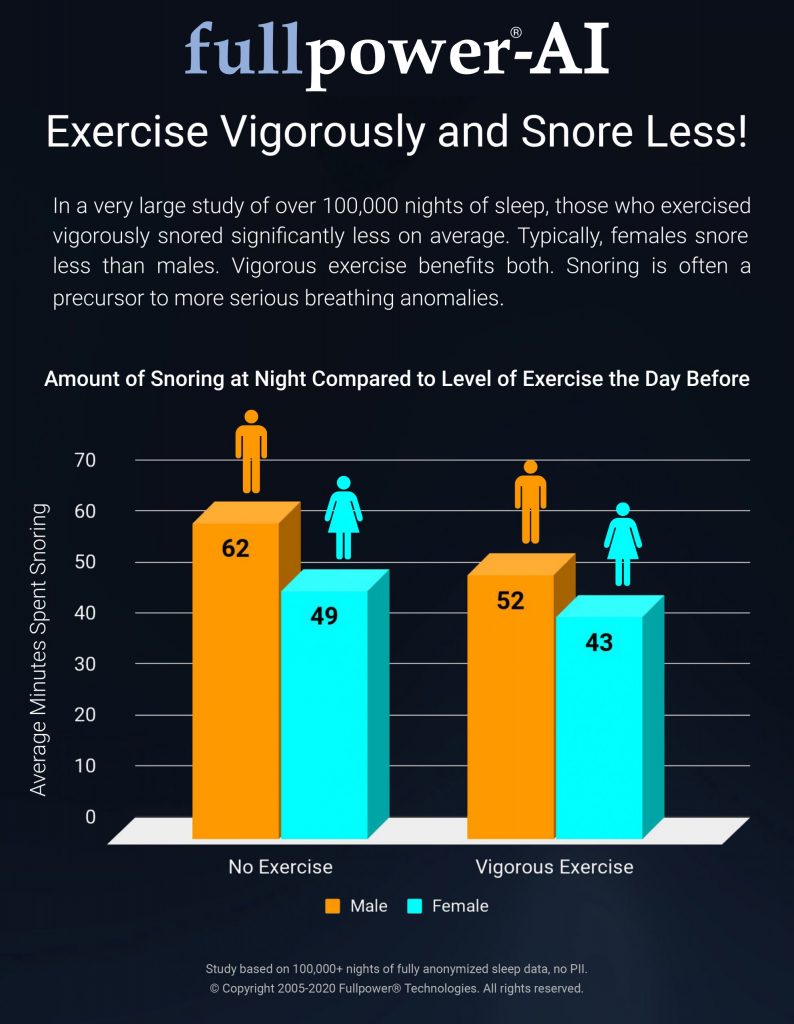 Research shows that there are meaningful benefits for both sexes in practicing regularly vigorous exercise such as HIIT (high Intensity Interval training). In a very large study of over 100,000 nights of sleep, those who exercised vigorously snored significantly less on average. Typically, females snore less than males. Vigorous exercise benefits both. Snoring is often a precursor to more serious breathing anomalies.