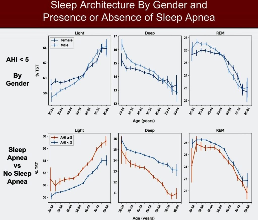 - Deep Sleep and REM Sleep: Deep and REM sleep percentages decline with age. Notably, individuals with sleep apnea (AHI > 5) experience significantly reduced deep sleep across all age groups.